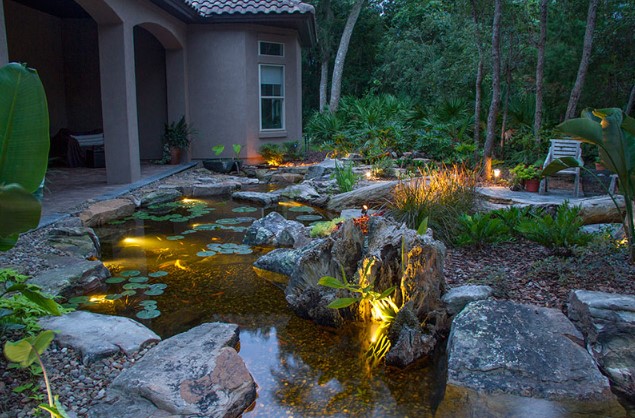 - No solo se trata de iluminar el agua. También debes resaltar las zonas secas que decoran el estanque: rocas, plantas, caminos y elementos paisajísticos.
